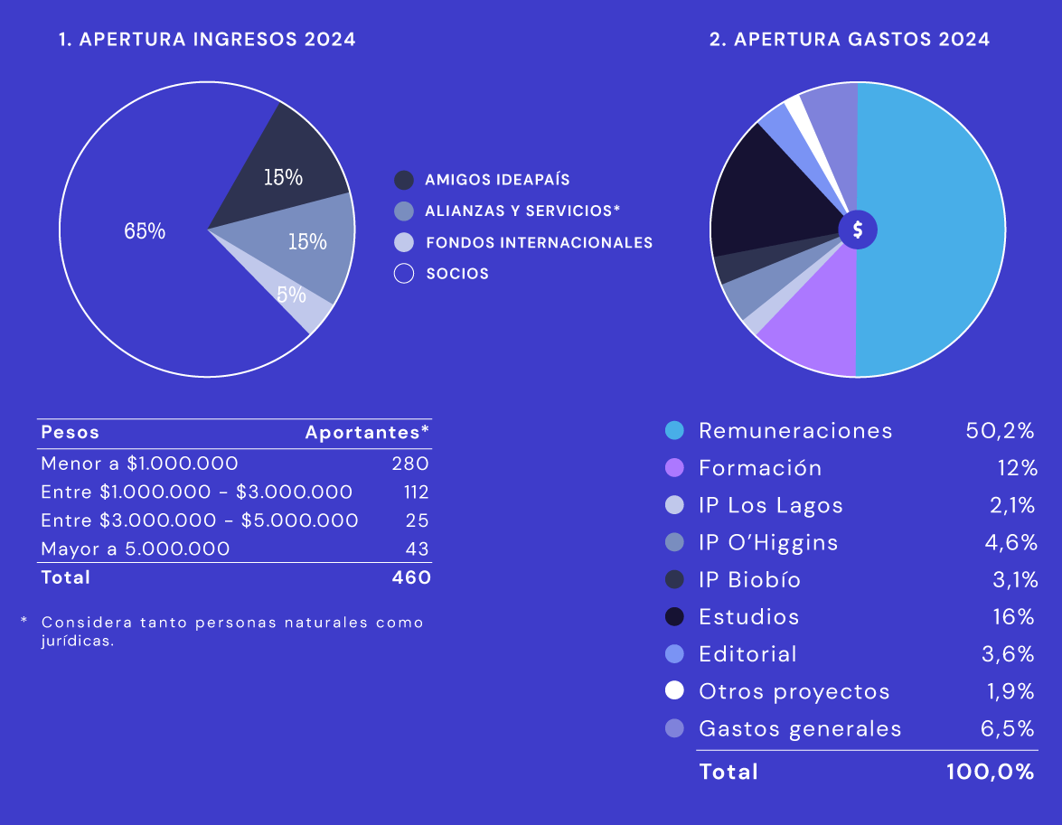 IdeaPaís es una fundación sin fines de lucro. Nuestros ingresos provienen principalmente de donaciones por parte de personas naturales, jurídicas y alianzas con otras entidades. Como política de financiamiento ningún aporte puede superar el 10% del presupuesto anual, de manera de resguardar nuestra independencia.